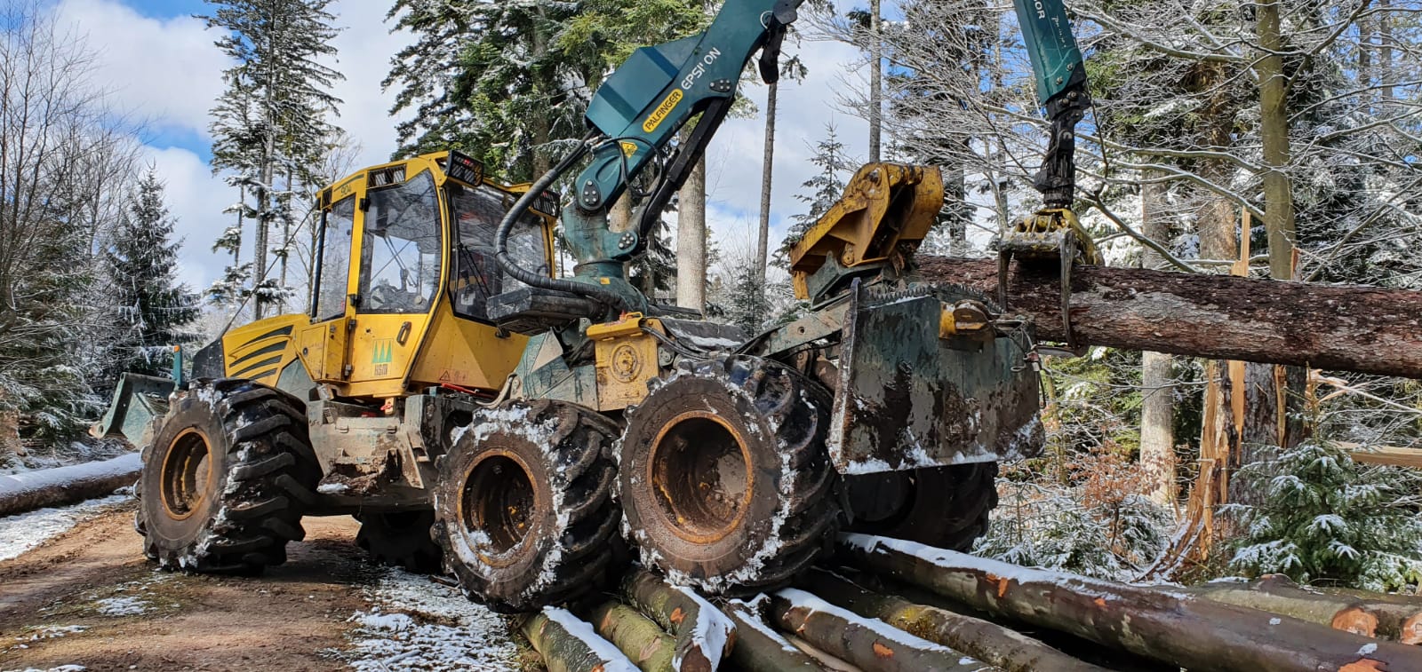 Die gefällten Bäume werden aus dem Wald herausgezogen und über Rückegassen an die Fahrwege zu Poltern aufgestapelt.